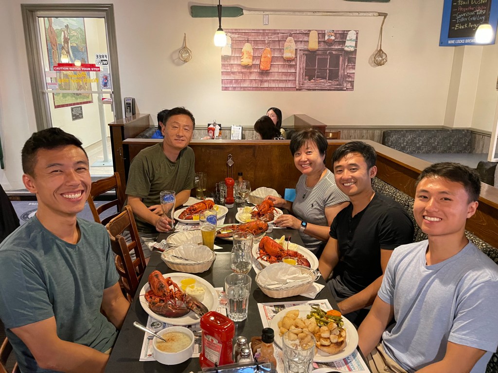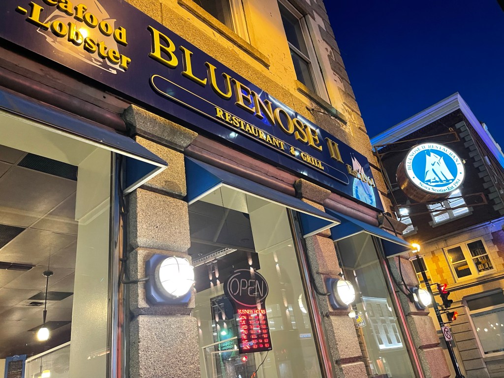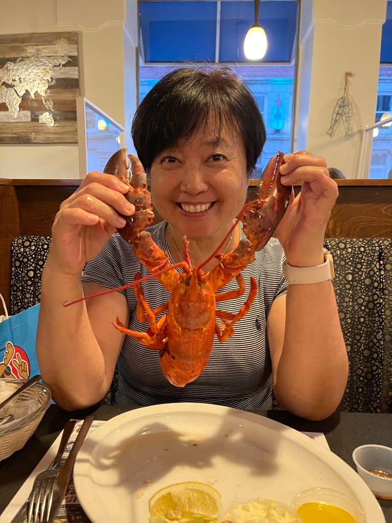 大家休息了一下,准备去吃龙虾。一路上我就念叨,那时候穷,没把龙虾吃够了。老二说,这出来好几天了,还没吃到龙虾,今晚一定要吃到。三儿找的餐馆要等一个半小时,老公找的Blue Nose two,刚好有位置,我直接要了两个龙虾,吃个痛快。