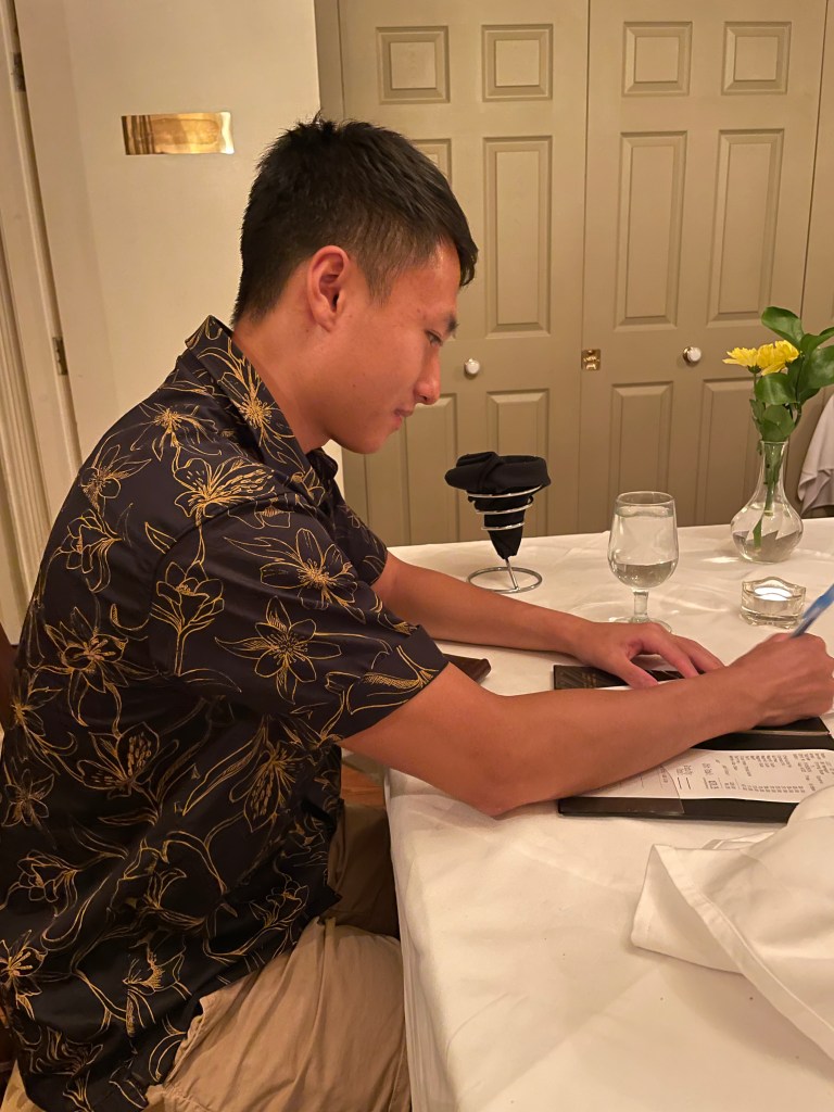 度假前,孩子们就商量好要请我们吃饭。这一路上的忆苦思甜确实打动了孩子们。他们找最好的餐馆请我们吃饭,让我们有解放的感觉。