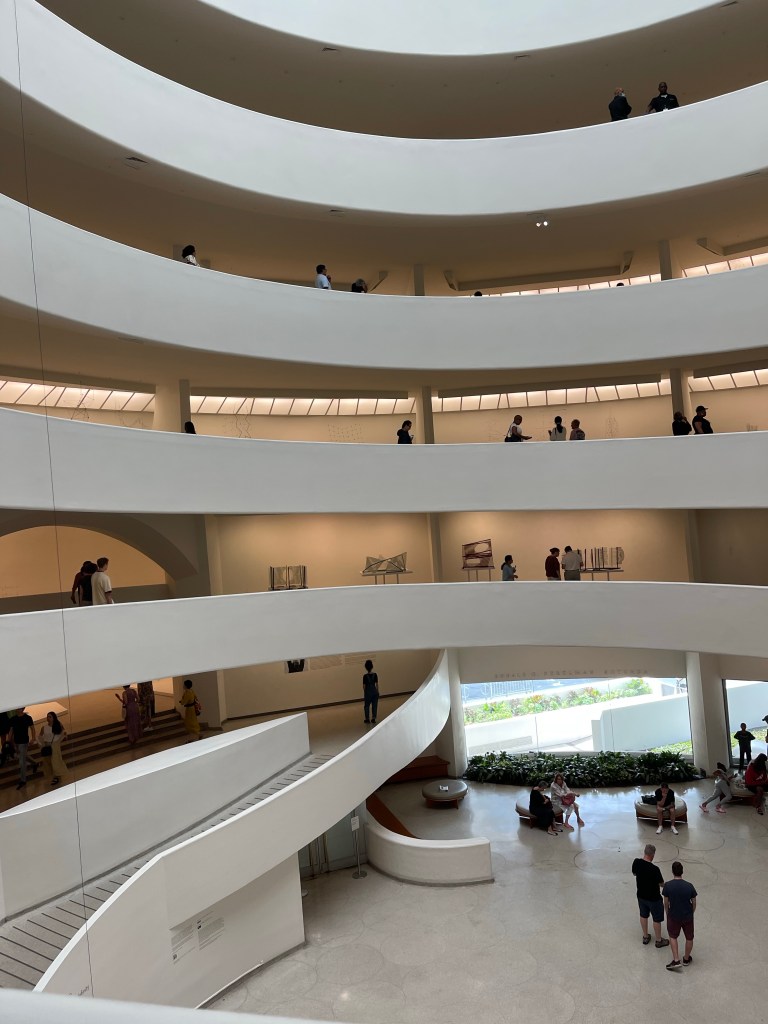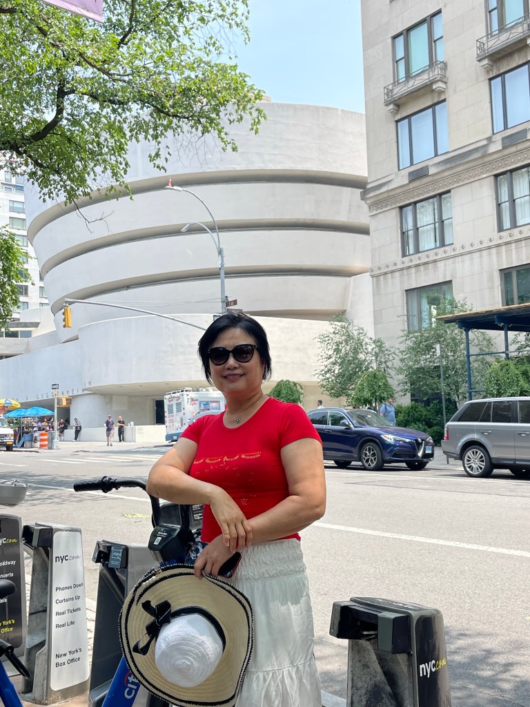 在第五大道博物馆街上有一个独特的建筑。形状和周围的建筑极不协调,这就是不好发音的Solomon R. Guggenheim Museum.所罗门·R·古根海姆博物馆。整栋楼没有阶梯,都是环线上升的。