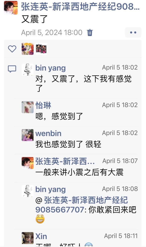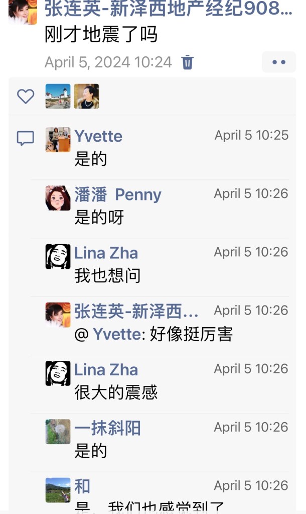 离我在新泽西的家就15英里。地震发生时我在纽约的家里。坐在二十层的餐桌旁,感到自己在上下抖动。心想地铁不会有这么大动静,而且平时也没有感觉。立刻意识到地震了,问了站在厨房水池边的先生是不是地震了,得到可定答复,立刻就在朋友圈发问:刚才地震了吗?