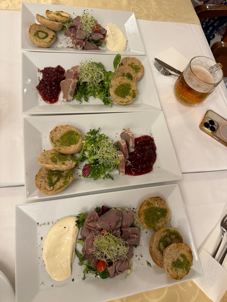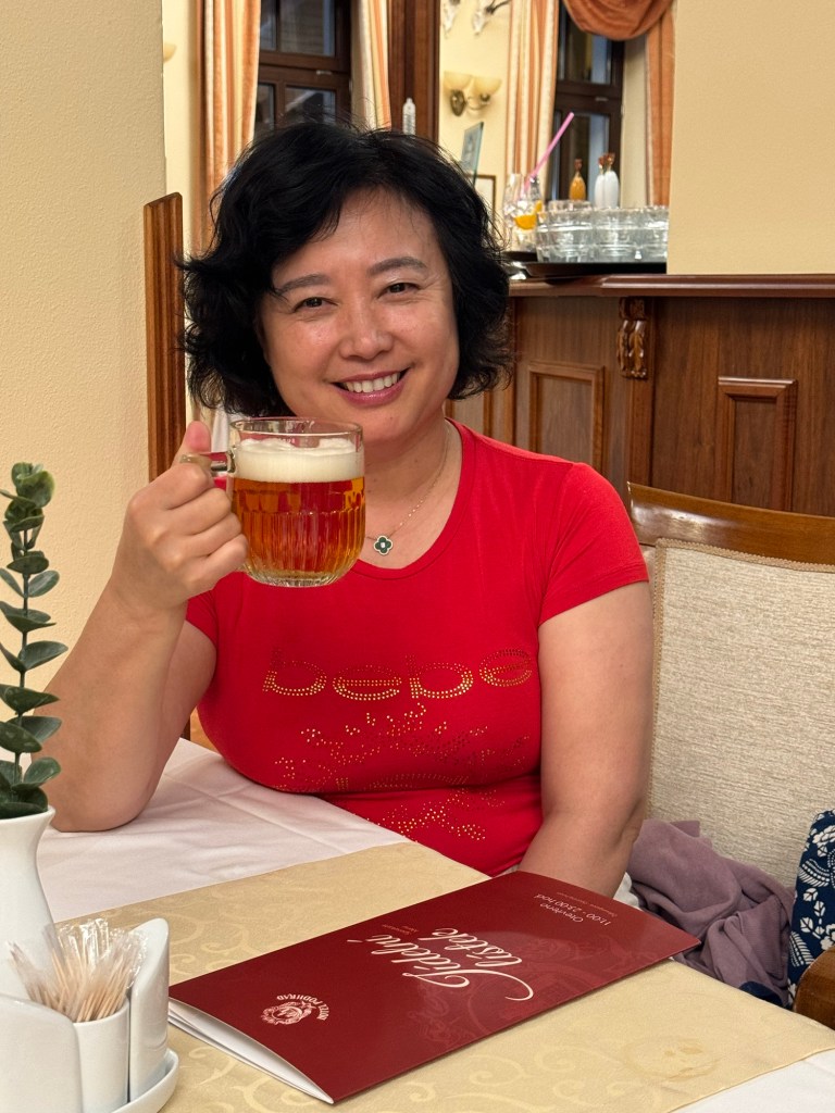 第二晚的旅馆Hotel Podhrad在捷克的一个Hluboká 小镇上。原计划是去布拉格附近住下的,可是谷歌地图在捷克的数据不好,总把我们带到一个没有修好的高速上。大家决定离开高速就近找地方住下。这个Hluboká 小镇还有一个城堡,周围景色很美,大家决定第二天在这里玩一下。我们高高兴兴的直奔Hotel Podhrad。晚上安顿下来,我还请大家在旅馆喝啤酒。