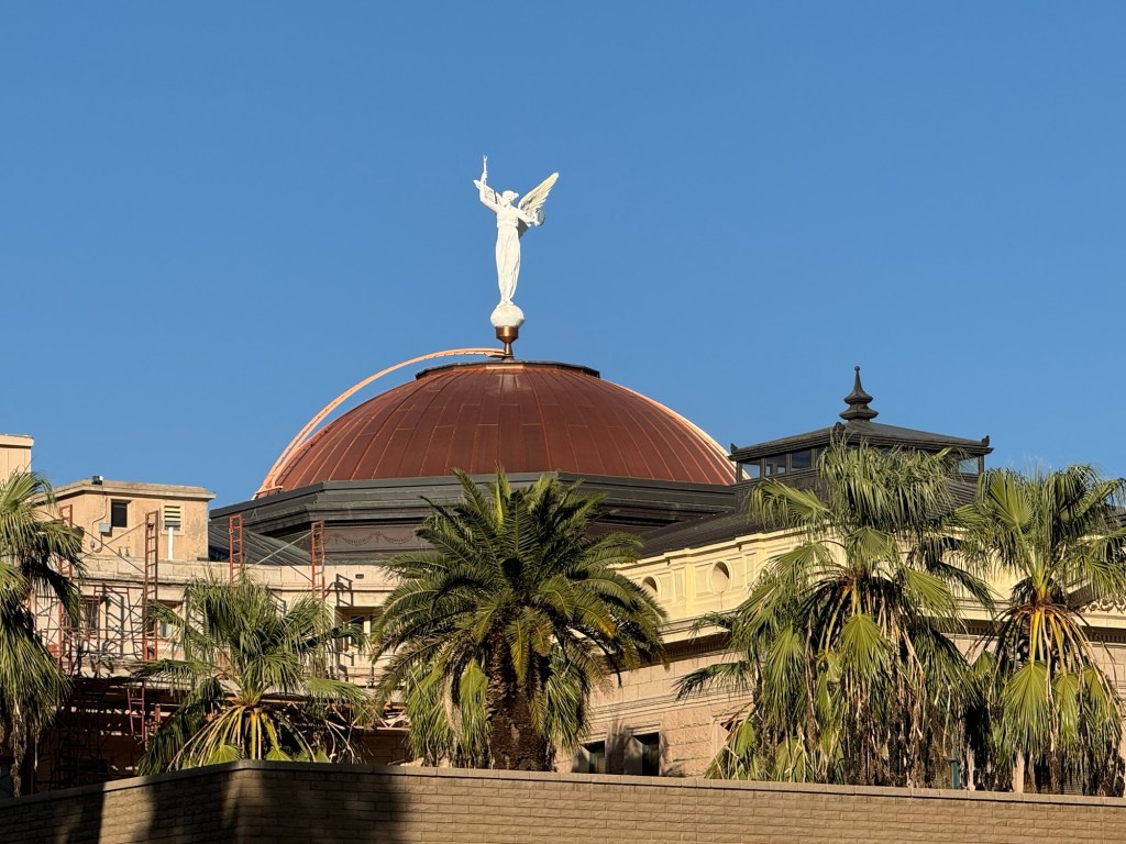 参观了亚利桑那State Capitol,这里也是一个博物馆,有讲解员。她告诉我们这个议会大厦是全美造价最低的议会建筑。铜质的圆顶标识着亚利桑那是产铜大州,顶上矗立的胜利女神可以转动,当年只花150美元。