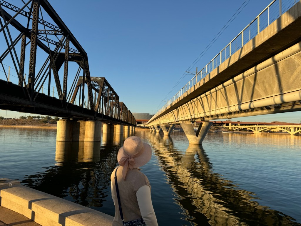 Tempe, 在凤凰城边,亚利桑那大学也在那里。太阳在下山之前,落日把这里照得一片金黄。飞机场就在附近,经常看到飞机低空飞行在湖面上,火车,汽车,船只和行人在一个画面里。