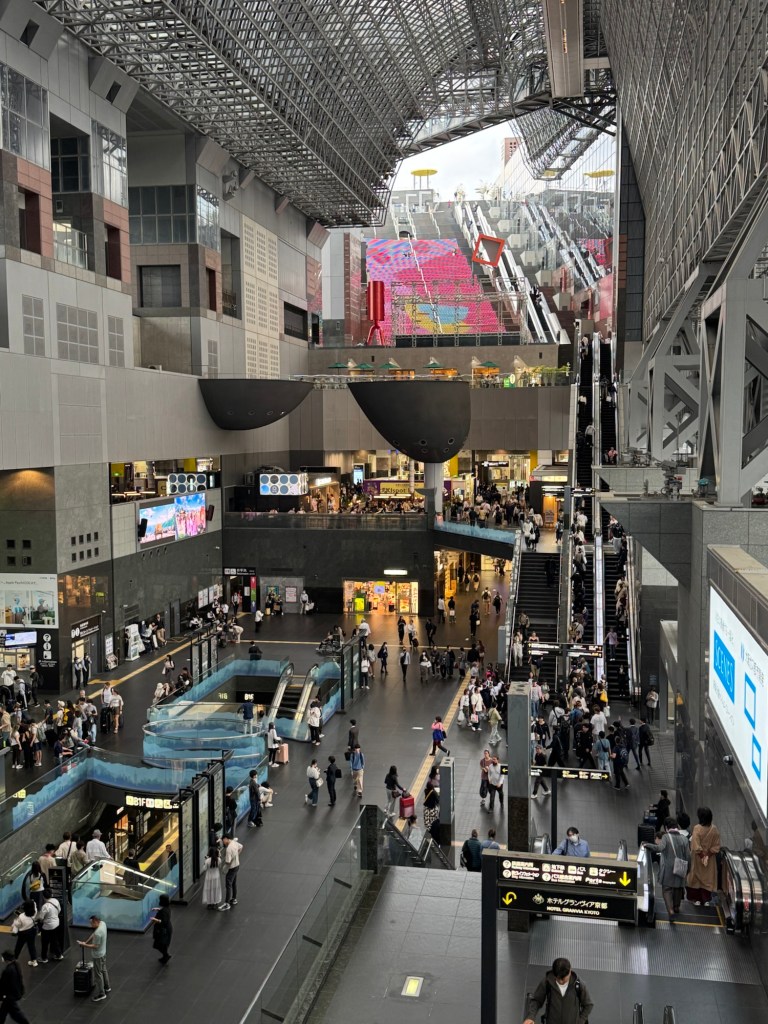 火车站位于京都市下京区,毗邻京都塔,是市中心的核心区域。现车站建筑于1997年重建完成,取代了1952年的旧站。由建筑师原广司设计,以后现代风格著称,以“都市之门”为概念,通过钢架、玻璃与几何结构营造出未来感。